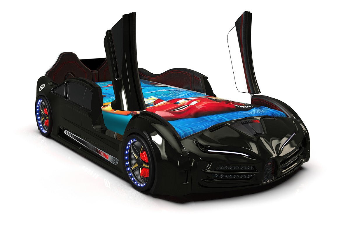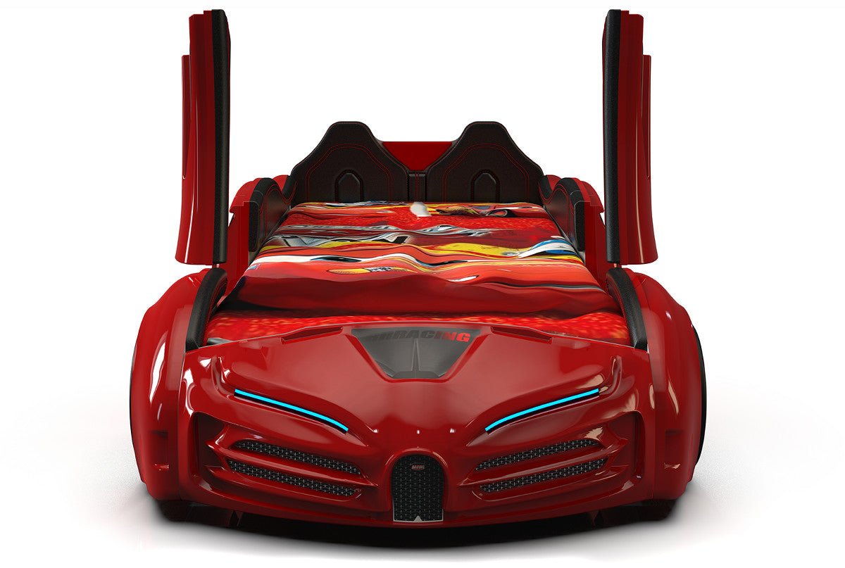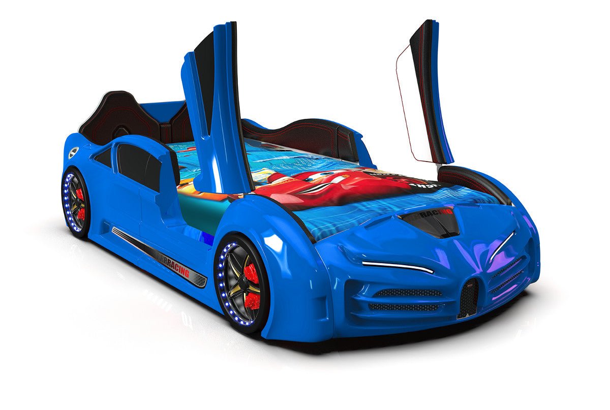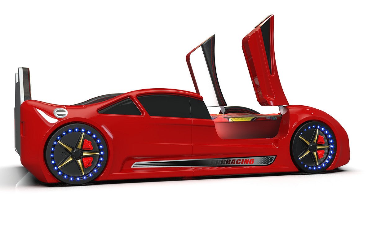 Das Autobett ist gestaltet wie ein stylisches Auto, komplett mit realistischen Details wie Rädern, Scheinwerfern und einer aerodynamischen Karosserie. Die Türen des Bettes werden nach oben geöffnet, ähnlich wie bei vielen Luxusautos oder Sportwagen. Dies verleiht dem Bett einen zusätzlichen Hauch von Authentizität und Abenteuer. Die Beleuchtung sorgt für eine sanfte und beruhigende Atmosphäre im Zimmer und schafft gleichzeitig eine coole Atmosphäre, die das Auto-Thema des Bettes unterstreicht. Mit einer Fernbedienung können verschiedene Soundeffekte gesteuert werden, die das Erlebnis des Autobettes noch lebendiger machen. Von Motorengeräuschen bis hin zu Hupen und anderen Fahrzeugklängen bietet das Bett eine interaktive und unterhaltsame Erfahrung für dein Kind.