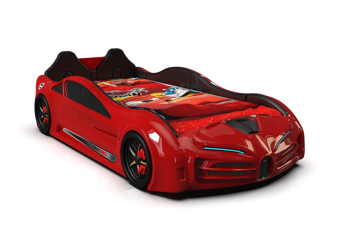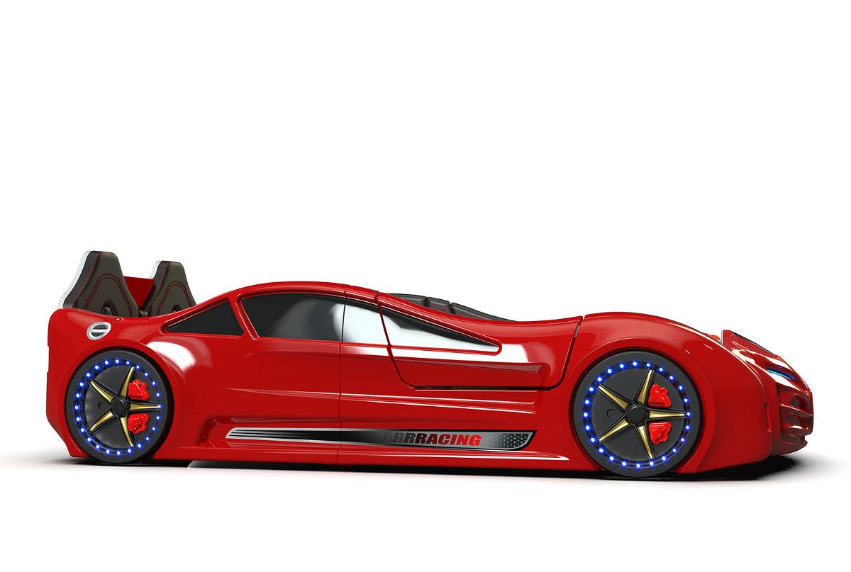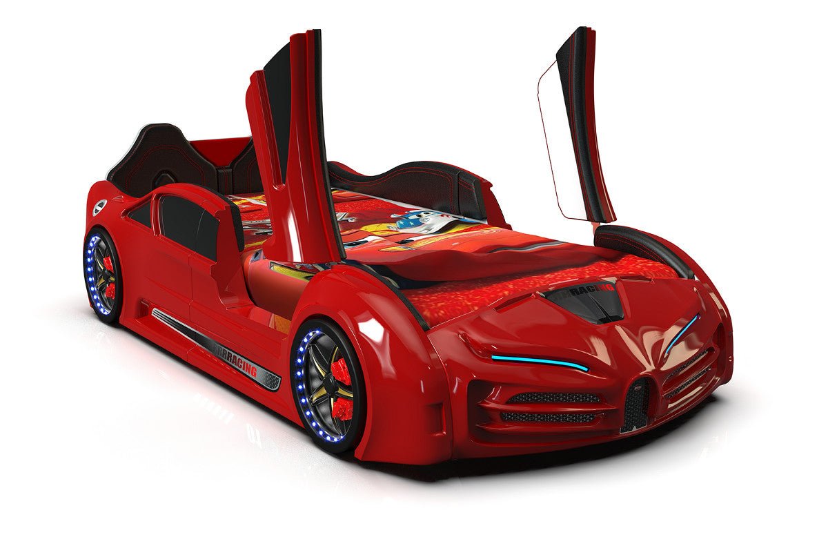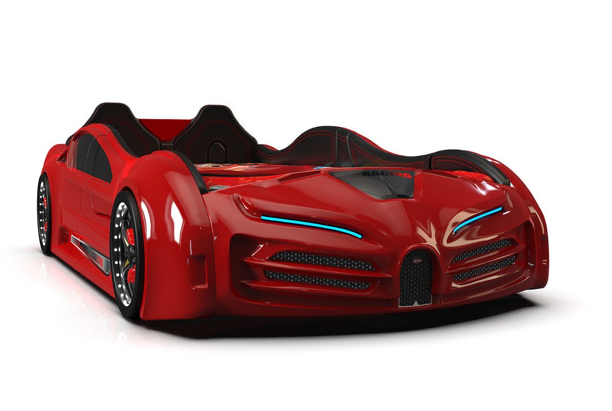 Das Autobett ist gestaltet wie ein stylisches Auto, komplett mit realistischen Details wie Rädern, Scheinwerfern und einer aerodynamischen Karosserie. Die Türen des Bettes werden nach oben geöffnet, ähnlich wie bei vielen Luxusautos oder Sportwagen. Dies verleiht dem Bett einen zusätzlichen Hauch von Authentizität und Abenteuer. Die Beleuchtung sorgt für eine sanfte und beruhigende Atmosphäre im Zimmer und schafft gleichzeitig eine coole Atmosphäre, die das Auto-Thema des Bettes unterstreicht. Mit einer Fernbedienung können verschiedene Soundeffekte gesteuert werden, die das Erlebnis des Autobettes noch lebendiger machen. Von Motorengeräuschen bis hin zu Hupen und anderen Fahrzeugklängen bietet das Bett eine interaktive und unterhaltsame Erfahrung für dein Kind.