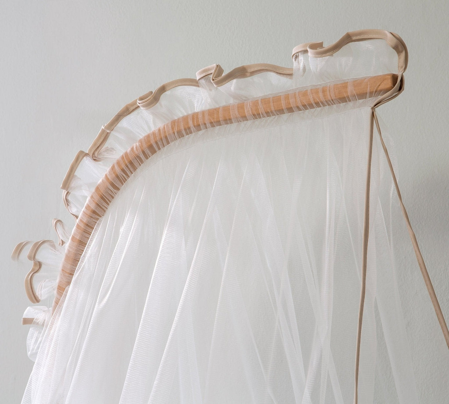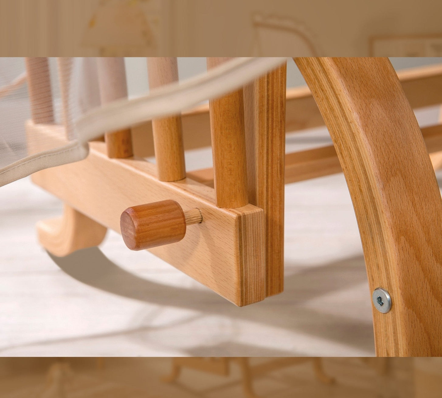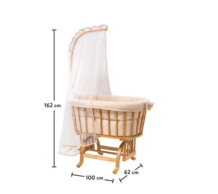 Diese Babywiege im natürlichen Holz-Design ist zusammen mit dem Betthimmel, der gleichzeitig ein Moskitonetz Schutz vor lästigen Mücken ist, einen kuscheligen Schlafplatz für Ihr Neugegorenes. Dank der Schwenkfunktion wiegen Sie Ihr Kleines sanft in den Schlaf. Die Füße sind bei diesem Modell gummiert, um Kratzer auf Ihrem Fußboden zu vermeiden. Zum Lieferumfang gehören ein Kissen, eine Babybettdecke, das Bett und das Moskitonetz.