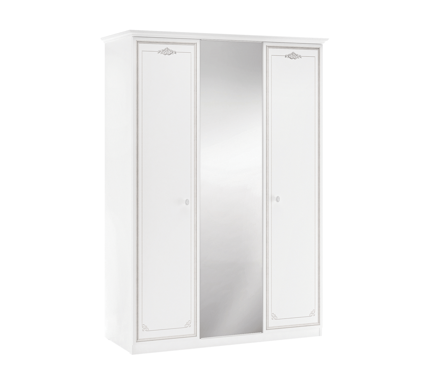 Kleiderschrank Selena Grau (3 Türen) Dieser wunderschöne Kleiderschrank bietet viel Platz für eine großzügige Prinzessinnen-Garderobe. Die Kranzleiste und die schönen Verzierungen an den Fronten, unterstreichen den Prinzessinnencharakter und lassen den Schrank zu einem dekorativen Element im Kinderzimmer werden. Der reine Weißton des Kleiderschranks ist absolut neutral und passt in jedes Mädchenzimmer und kann somit auf lange Sicht ein treuer Begleiter sein. Ausstattung: - 3 Türen