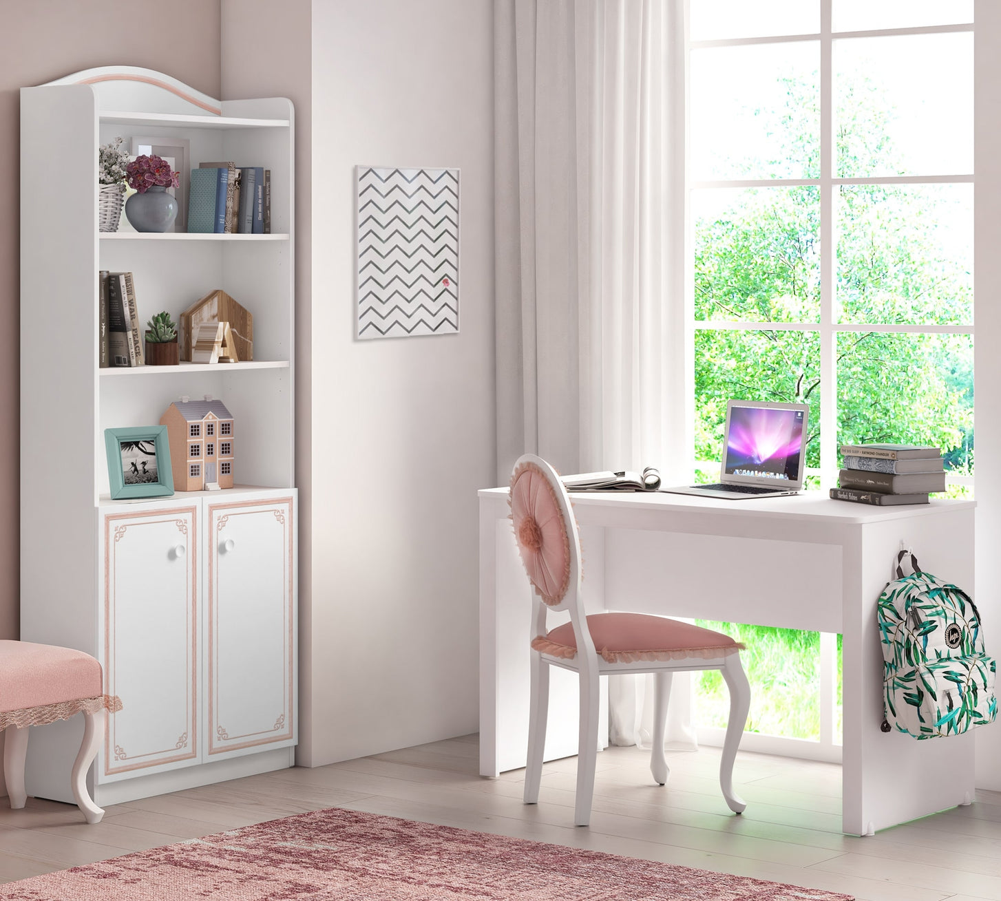 Mit dem weißen SELENA PINK Bücherregal ergänzen Sie das Kinderzimmer um ein praktisches Möbelstück, was durch seine schöne Formgebung und die dezenten rosa Elemente einen optischen Akzent setzt. Es ist mit dem Möbeln der SELENA PINK Serie, aber auch mit bereits vorhandenen Möbeln kompatibel. Durch die obere Muschelschale kann Ihr Kind sogar diesen Platz als Stauraum für Bücher oder Accessoires nutzen. Dazu stehen Ihrem Liebling 3 Regalböden und ein gut erreichbarer Schrank mit 2 Türen für all seine Sachen zur Verfügung. Der Clou bei diesem Möbelstück sind die leise schließenden Türen mit einem Bremssystem. In unserem Online-Shop finden Sie passende Möbelstücke wie ein Bett, einen Kleiderschrank, einen Schreibtisch und vieles mehr, um das Bücherregal im Kinderzimmer zu ergänzen.