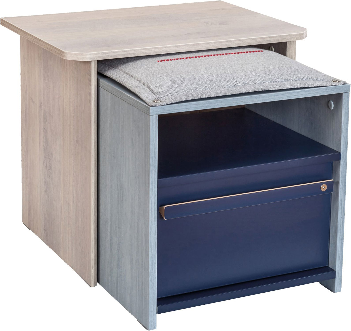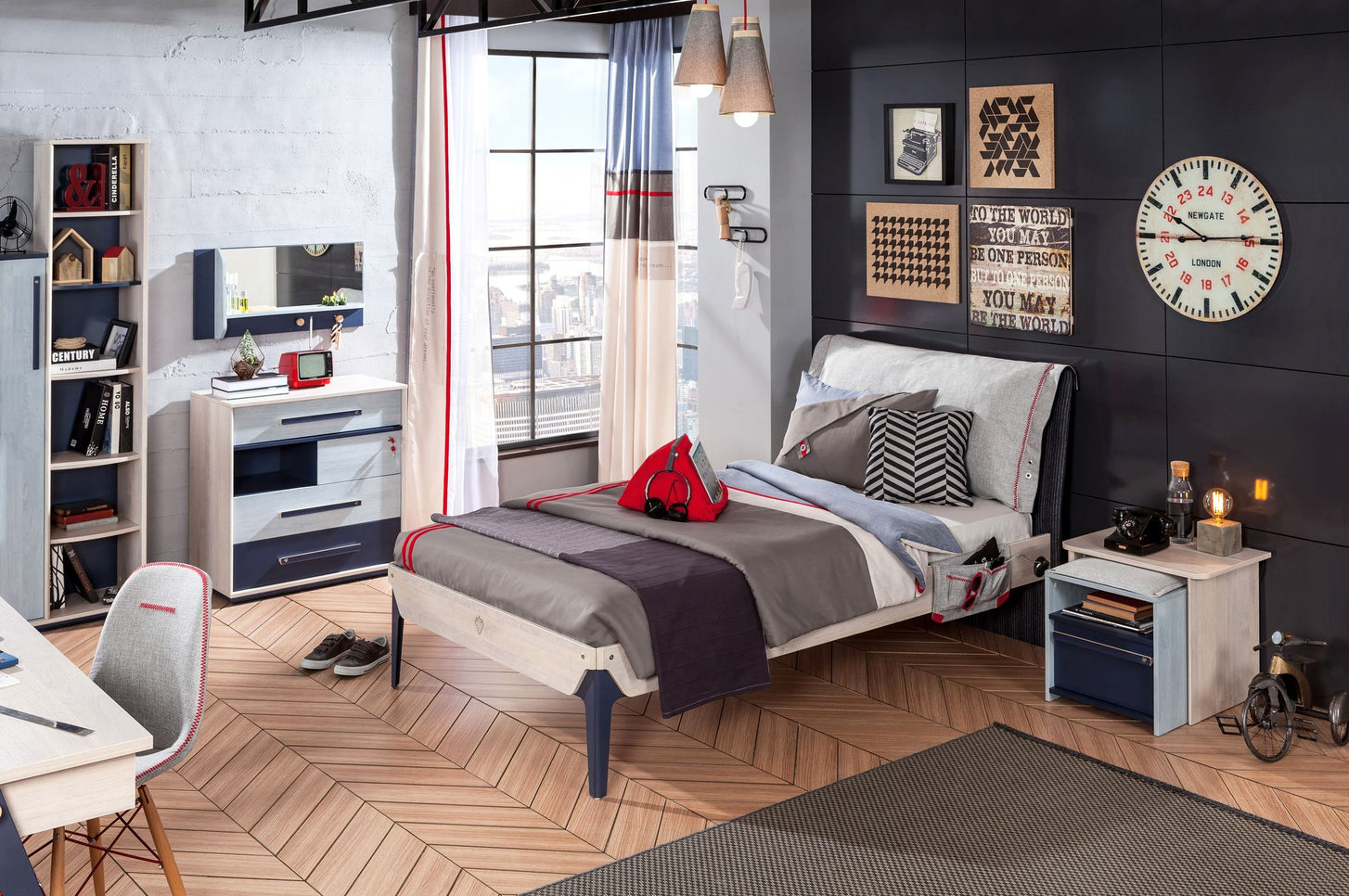 Die Möbelserie Trio umfasst eine große Auswahl an Kindermöbeln die für einen funktionellen und fantasievollen Lebensraum sorgen. Die modernen Grau- und Holztöne in Kombination mit marineblau sorgen für Ruhe im Kinderzimmer und laden zum relaxen und entspannen ein.