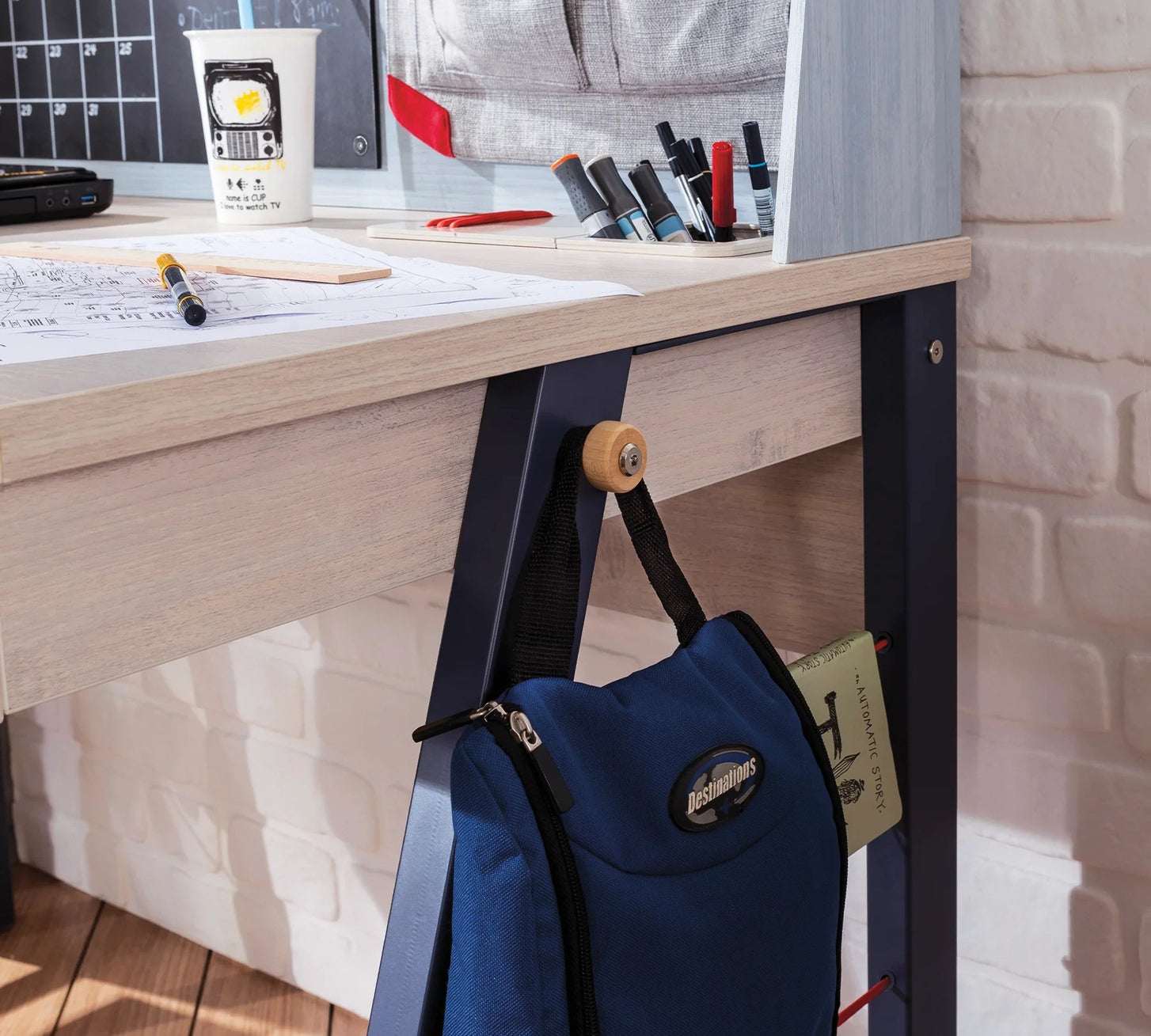 Der moderne Cilek TRIO Schreibtisch I ist nicht nur ein Ort zum Studieren, sondern auch ein Platz für kleine und große Künstler, um ihre Kreativität zu entfalten. Mit einem Schubkasten, einem offenen Ablagefach und eingebauten Stiftehaltern bietet er ausreichend Platz und Organisation. Die Garderobenknöpfe auf beiden Seiten ermöglichen das Aufhängen von Jacken oder Taschen. Optional kann der Schreibtisch mit einem Aufsatz erweitert werden, um zusätzlichen Stauraum zu schaffen.