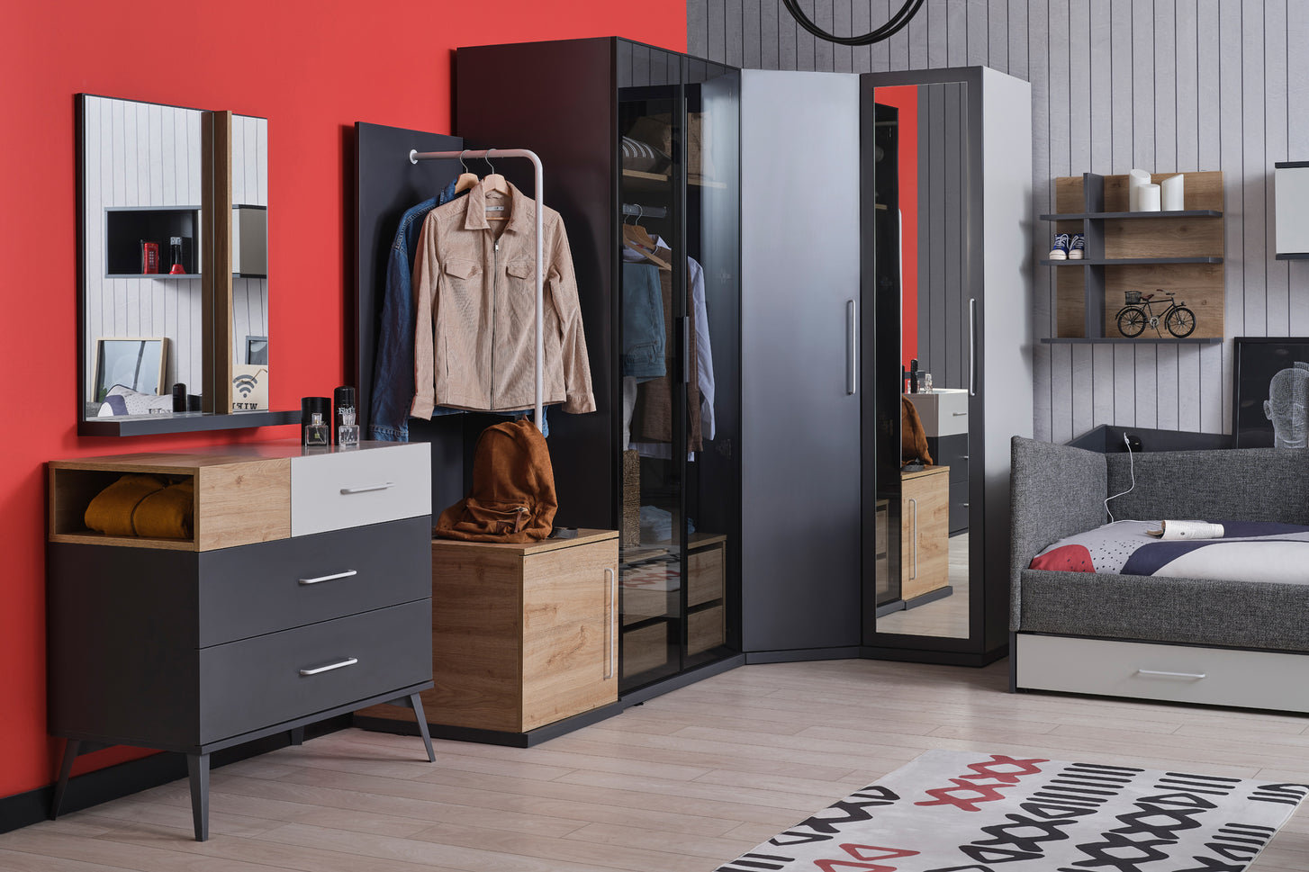 Der Kupa Harvey Eckkleiderschrank ist ein echtes Highlight für jedes Schlafzimmer oder Ankleidezimmer. Seine besondere Eckform ermöglicht es, den Raum optimal zu nutzen und gleichzeitig einen stilvollen Akzent zu setzen. Die zwei Türen aus dunklem Glas, die anthrazitfarbene Tür und die verspiegelte Tür schaffen einen spannenden Mix aus Materialien und Optiken. Im Inneren bietet der Schrank viel Platz für Ihre Kleidung, Schuhe und Accessoires. Der Kupa Harvey Eckkleiderschrank ist die perfekte Wahl für alle, die Wert auf Design und Funktionalität legen.