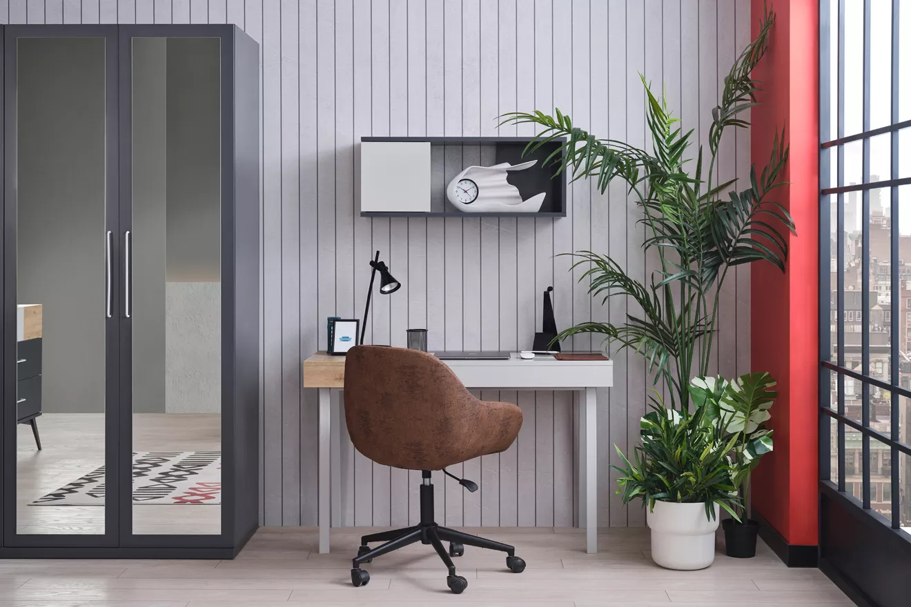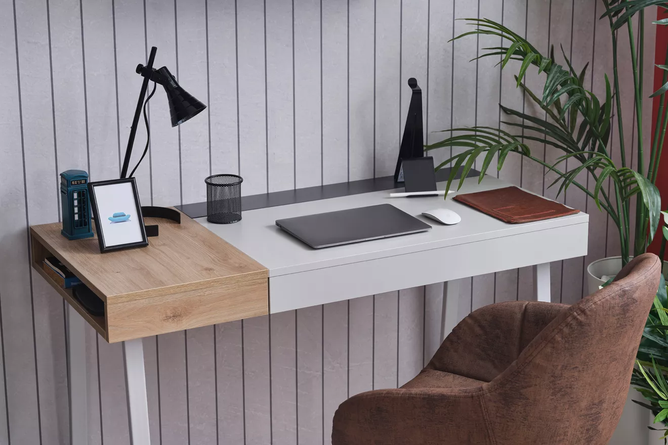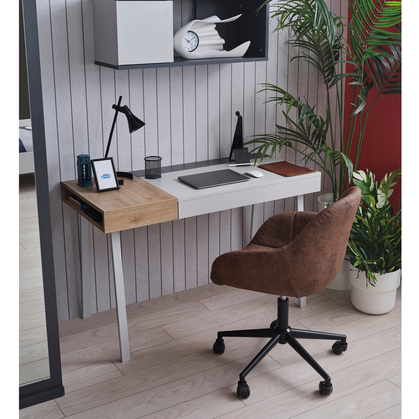 Moderner Schreibtisch Harvey von Kupa mit vielseitiger Oberfläche: die Platte vereint zeitloses Weiß, elegantes Grau und natürliche Holzoptik. Das praktische offene Fach links bietet zusätzlichen Stauraum für Bücher, Ordner oder Dokumente.