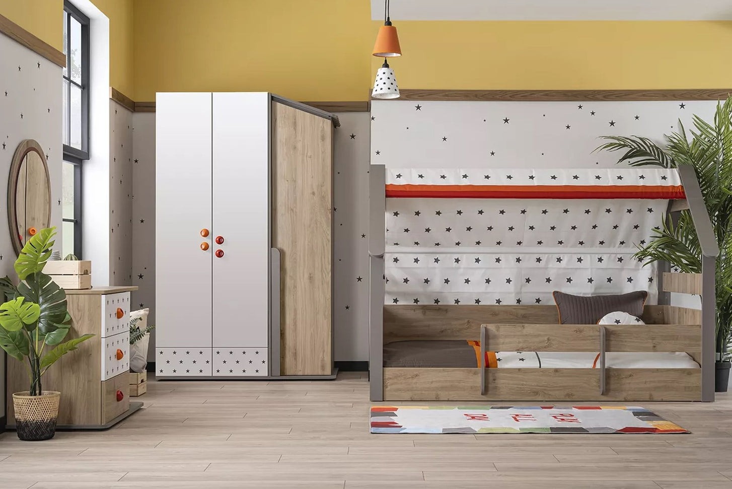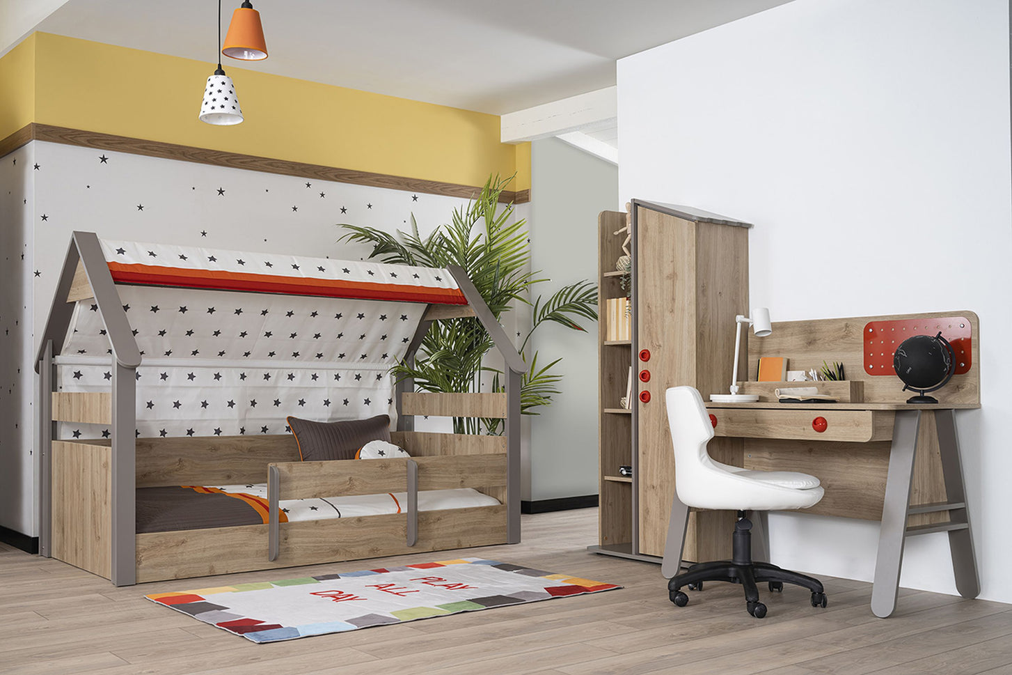 Das Hausbett Hut von Kupa begeistert mit seinem natürlichen Design und frischen Farbakzenten, die eine einladende Atmosphäre schaffen. Die großzügige Liegefläche von 100 x 200 cm bietet viel Platz zum Träumen, während die integrierte Absturzsicherung für zusätzliche Sicherheit sorgt. Ein besonderes Highlight ist das stilvolle Dach, das mit einem weißen Stoffhimmel mit dunklen Sternen und einem rot-orangen Abschluss eine gemütliche Schlafumgebung schafft. Der auf den Bildern teilweise gezeigte Bettkasten ist optional erhältlich.
