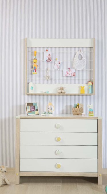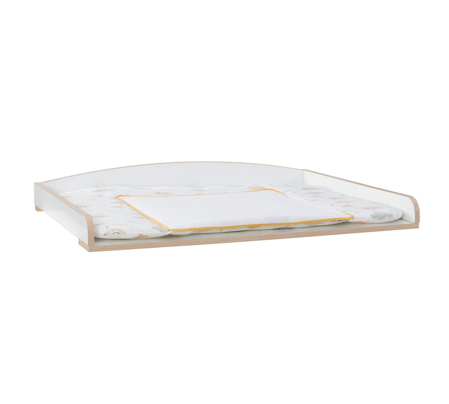 Mit dem Aufsatz ist die Kommode schnell zum Wickeltisch verwandelt. Die Polsterung ist abnehmbar und waschbar. Wenn der Wickelaufsatz nicht mehr benötigt wird, kann dieser sich auch perfekt als Regal an der Wand machen.