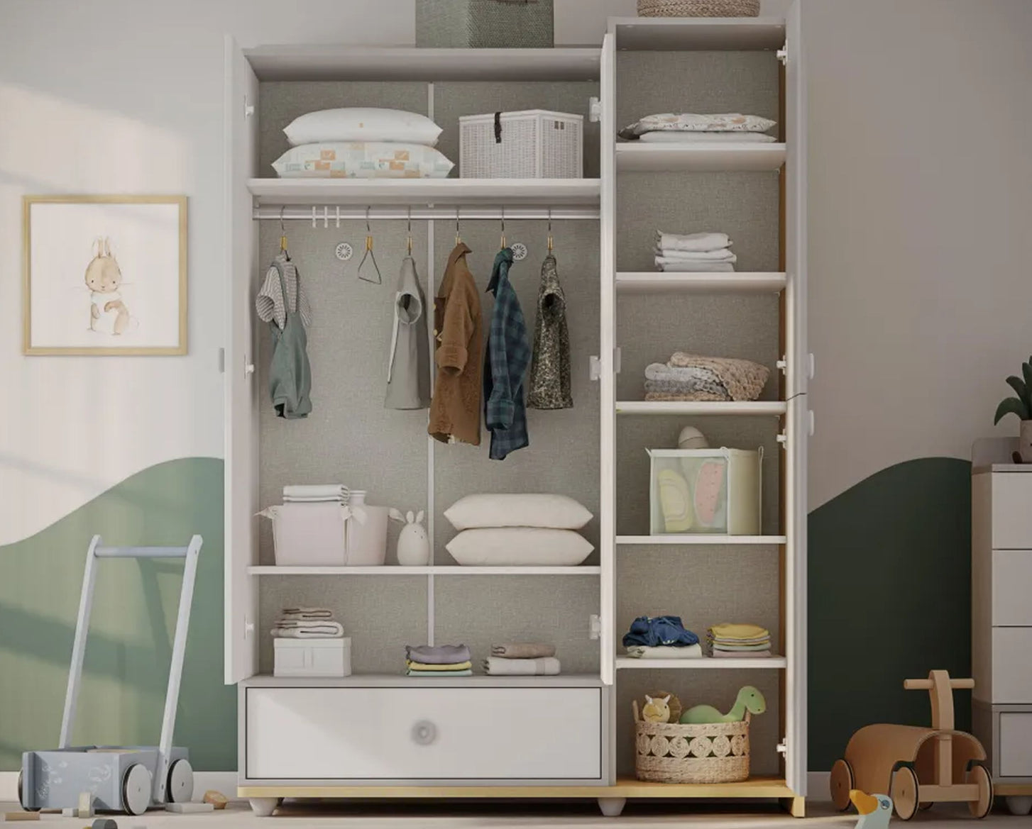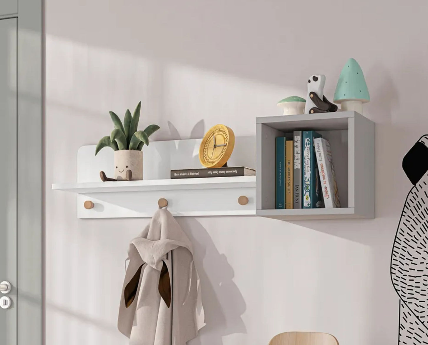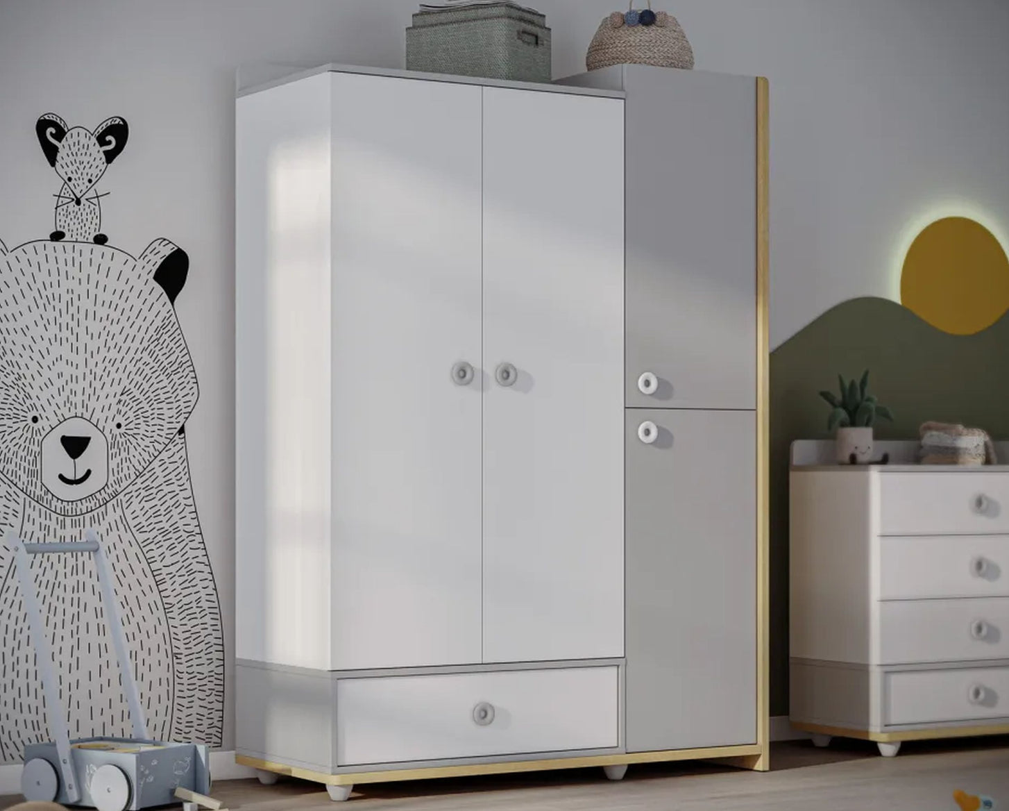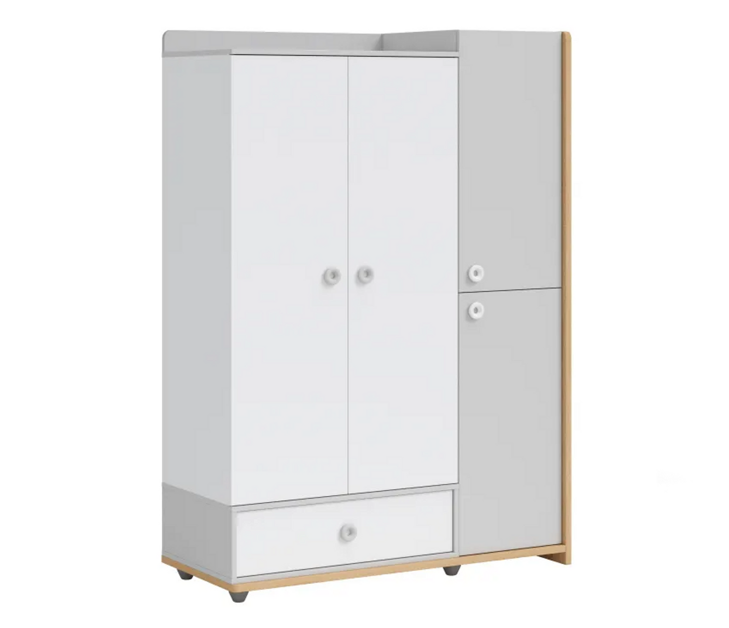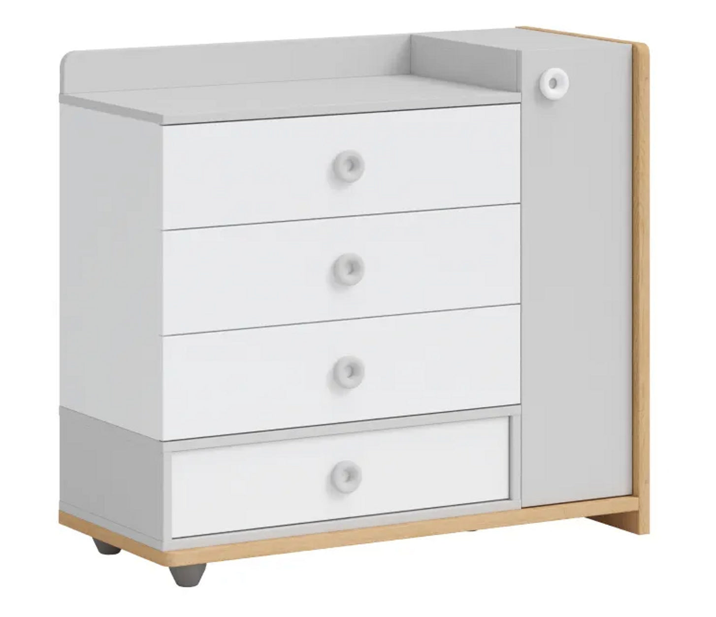 Der geräumige Kleiderschrank mit individuell anpassbaren Regalböden, Kleiderstange und großer Schublade schafft Platz für die wachsende Garderobe. Das asymmetrische Design mit Ablagefläche setzt einen modernen Akzent. Die elegante Kommode mit vier Schubladen und Tür sowie das passende Wandregal runden das Set perfekt ab. Die zeitlose Farbgebung in Weiß, Grau und Naturtönen sowie die abgerundeten Ecken machen ZUZO zu einer sicheren und langlebigen Wahl für Ihr Kinderzimmer.