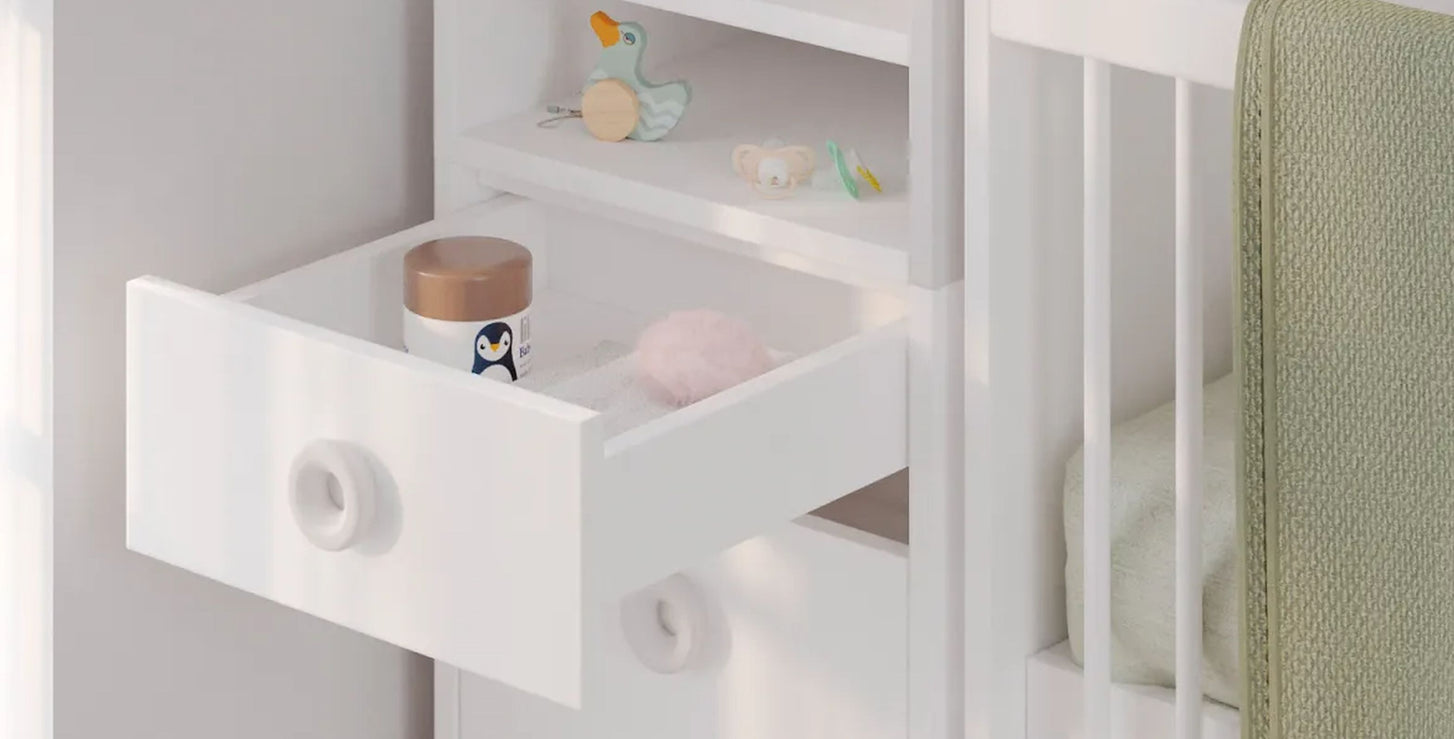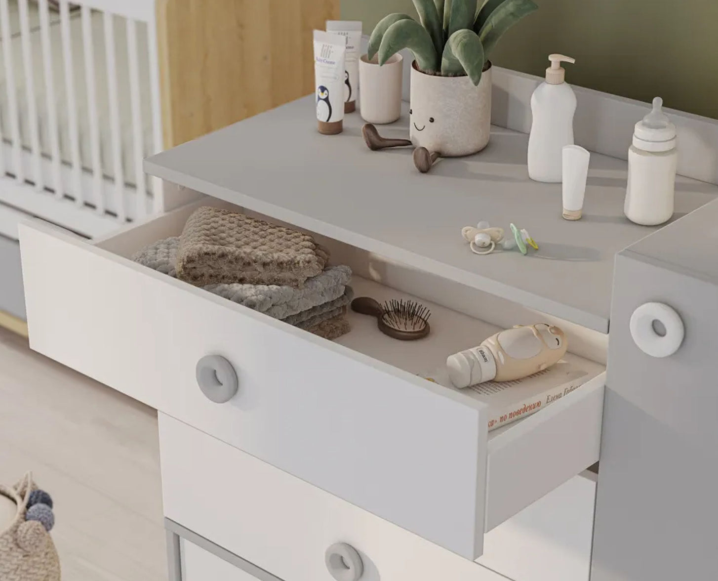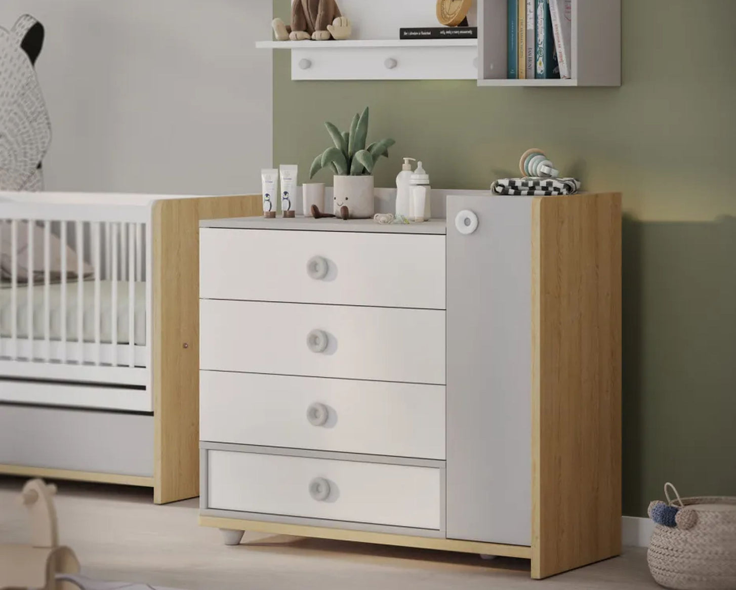 Das 4-teilige Babyzimmer-Set ZUZO von Newjoy begleitet Ihr Kind stilvoll vom Baby- bis ins Jugendalter. Das mitwachsende Bett (80 x 130/180 cm) mit Wiegenfunktion und höhenverstellbarer Liegefläche bietet Komfort und Sicherheit. Die integrierte Kommode mit offenem Fach und Schubladen sorgt für Ordnung und wird später zum praktischen Nachttisch.