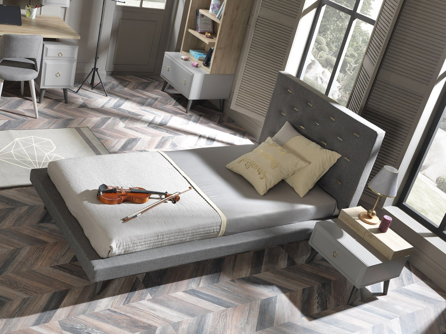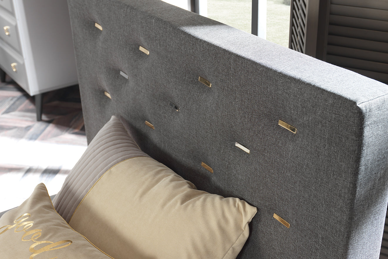 Das Jugendbett LUNA von Kupa vereint modernes Design mit durchdachtem Komfort. Das weich gepolsterte Kopfteil ist mit einer eleganten Steppung und goldfarbenen Akzenten verziert – ein stilvoller Blickfang für jedes Schlafzimmer.