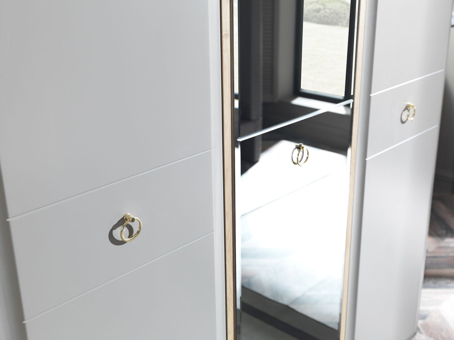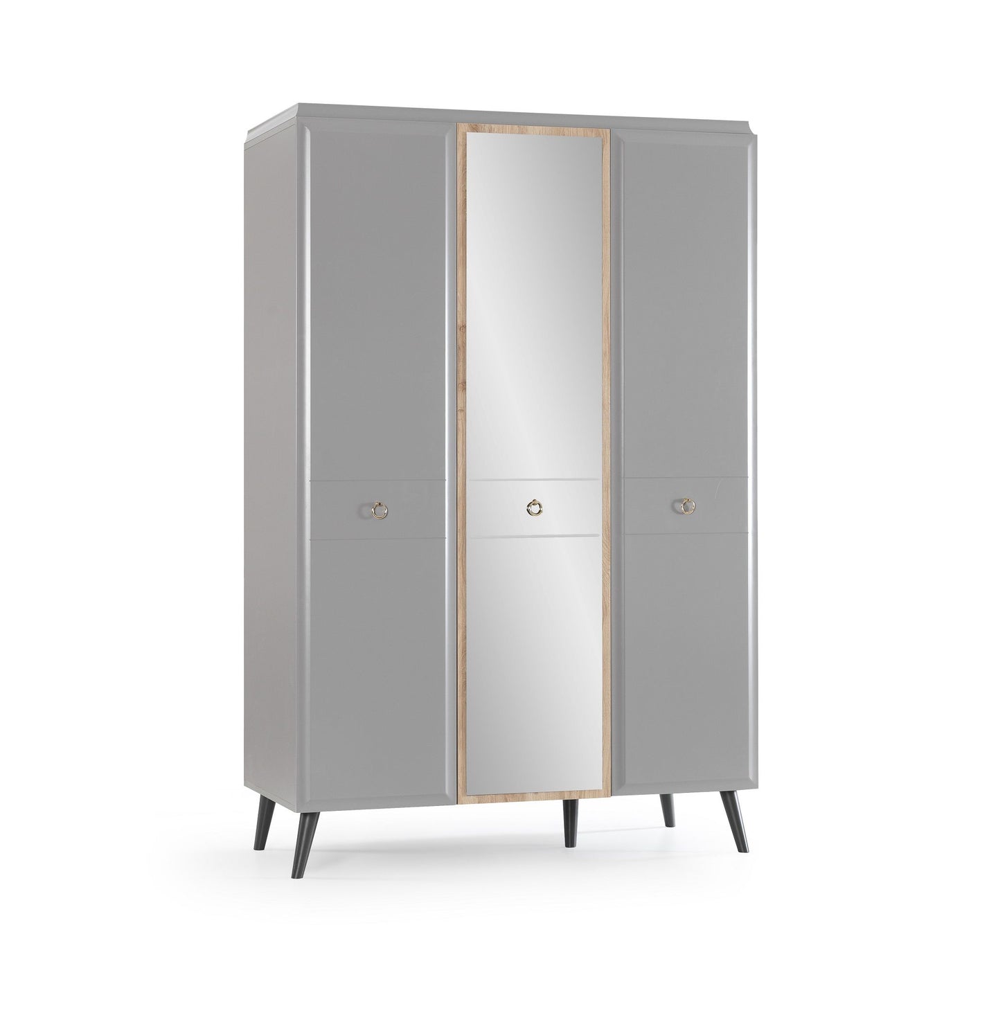 Der dreitürige Kleiderschrank LUNA überzeugt durch seine elegante Optik und praktische Funktionalität. Die Kombination aus Grau, Holzton und goldfarbenen Griffen verleiht dem Schrank einen modernen und zeitlosen Charakter.