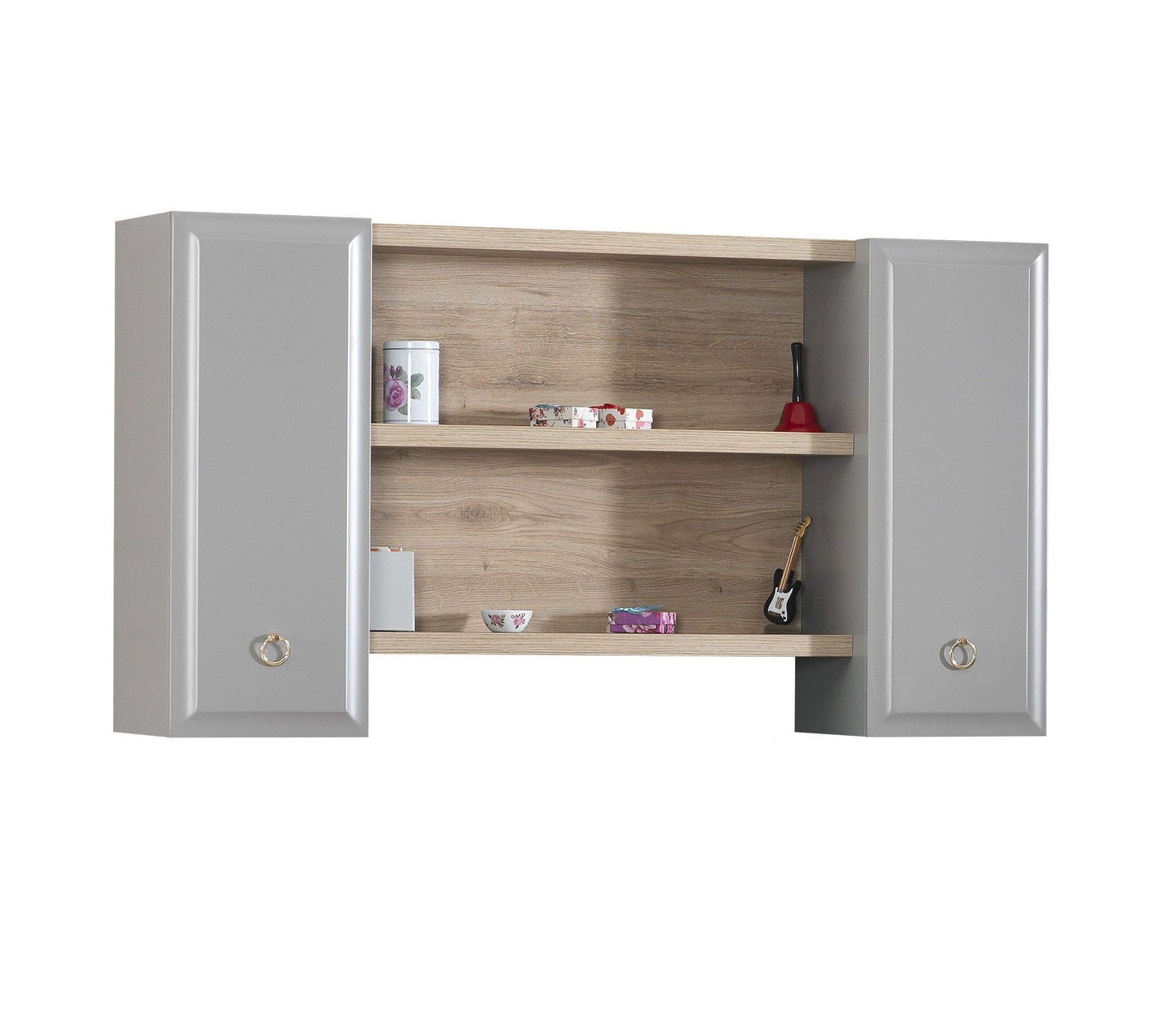 Das Wandregal LUNA von Kupa bietet besonders viel Platz und vielseitige Einsatzmöglichkeiten. Gefertigt in einem edlen Mix aus Grau und natürlichem Holzton, verfügt es über zwei geschlossene Schränke mit grauen Türen und eleganten goldfarbenen Griffen. Zwei offene Regalelemente in der Mitte sorgen für zusätzlichen, gut erreichbaren Stauraum. Dieses Regal überzeugt durch seine Geräumigkeit, flexible Nutzung und zeitlose Optik. Ideal für Bücher, Deko oder Alltagsgegenstände.