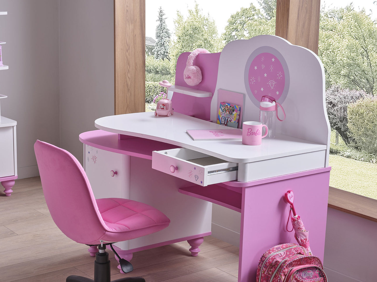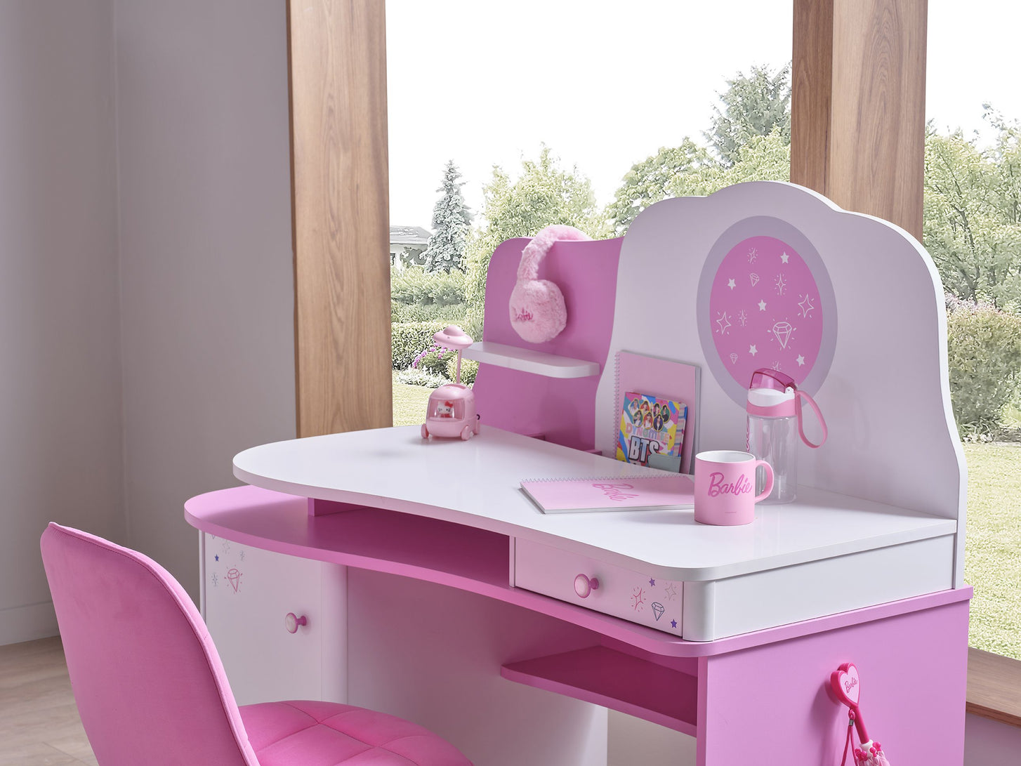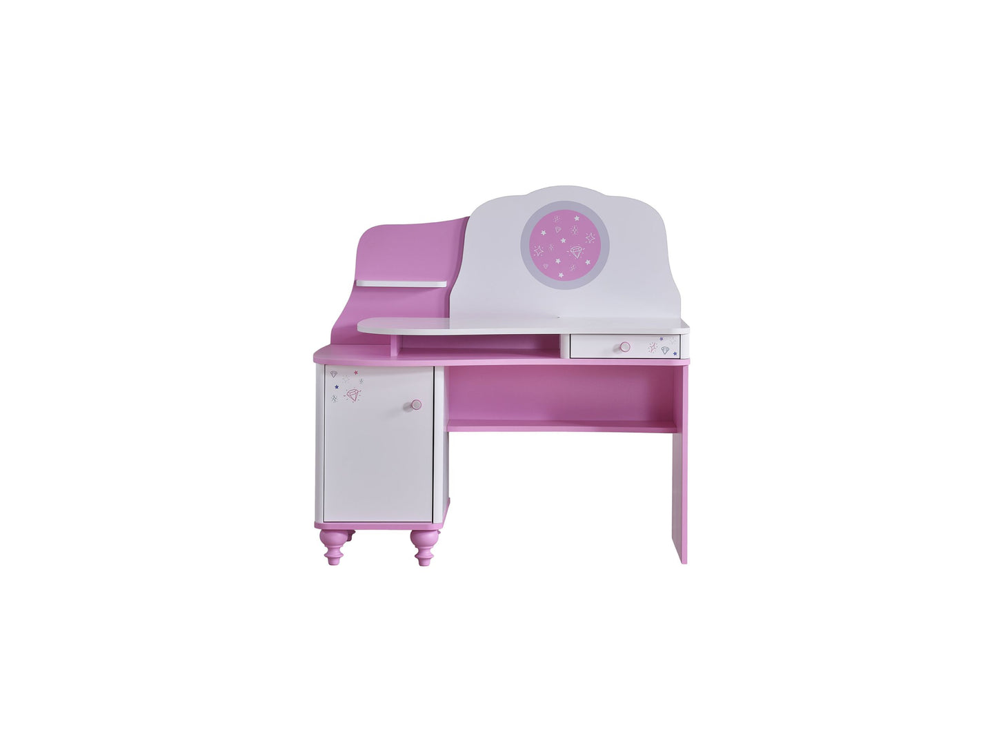- Schreibtisch in Pink und Weiß mit erhöhter Rückwand mit Regal
