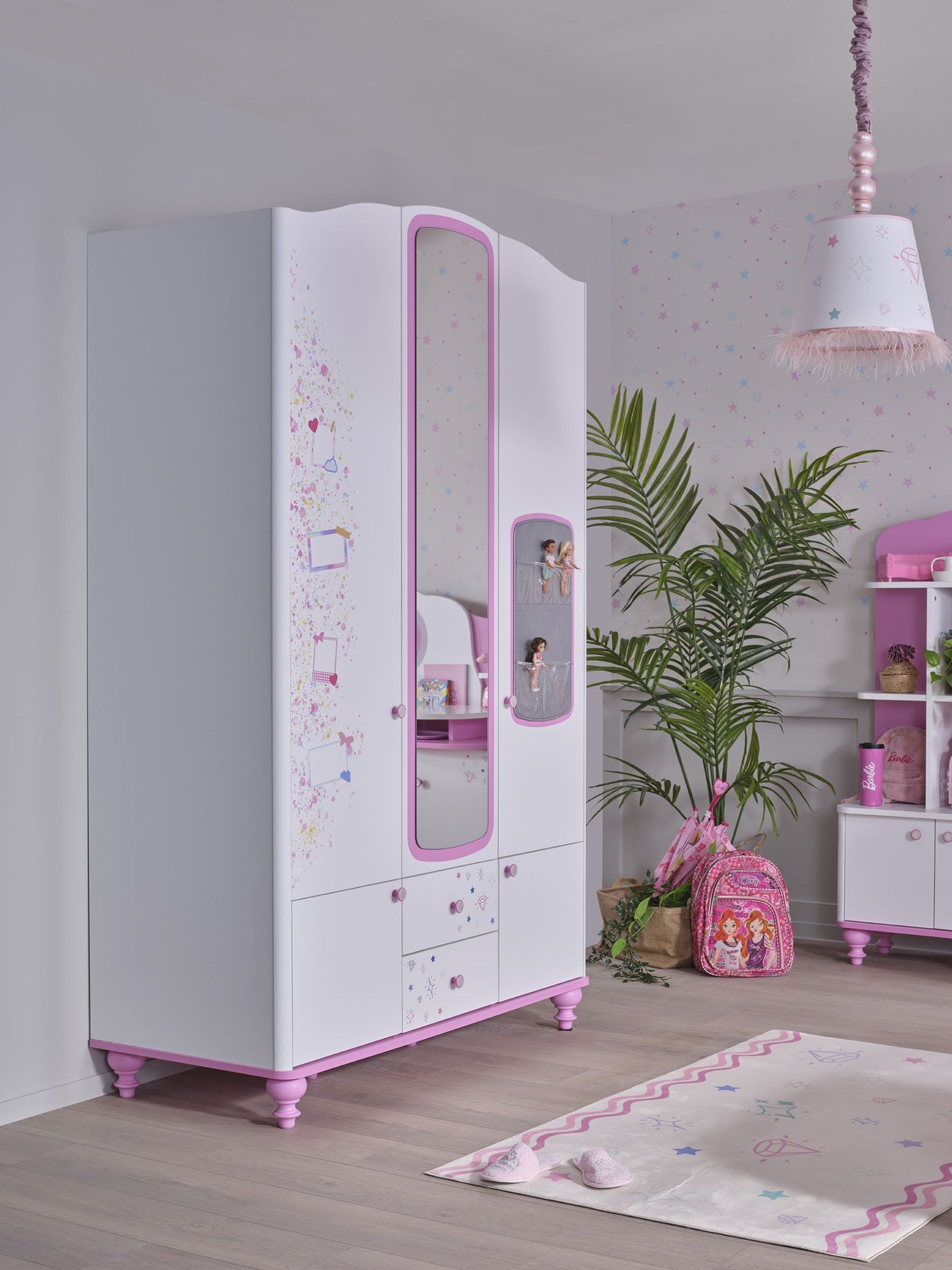 Der 3-türige Kleiderschrank LITTLE PRINCESS von Kupa kombiniert praktischen Stauraum mit einem liebevoll gestalteten Design in Weiß und Pink. Der geschwungene obere Abschluss unterstreicht den romantischen Look und verleiht dem Schrank eine verspielte, elegante Note.