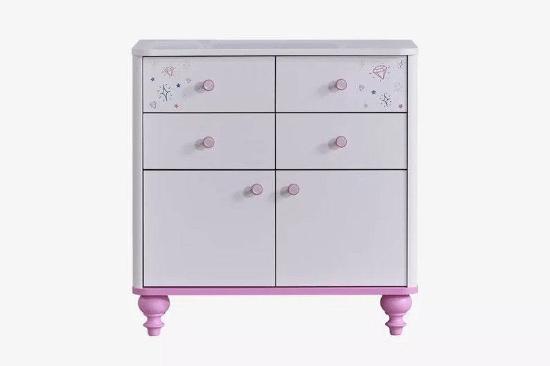 Die Kommode LITTLE PRINCESS von Kupa verbindet verspielten Charme mit praktischer Funktionalität. In einem zarten Farbspiel aus Weiß und Pink gestaltet, bietet sie hinter zwei Türen sowie in zwei großzügigen Schubladen jede Menge Stauraum für Kleidung, Accessoires oder Spielsachen. Die obere Schublade ist zusätzlich mit einem dekorativen Druckmotiv verziert, das farblich perfekt zum Design passt.