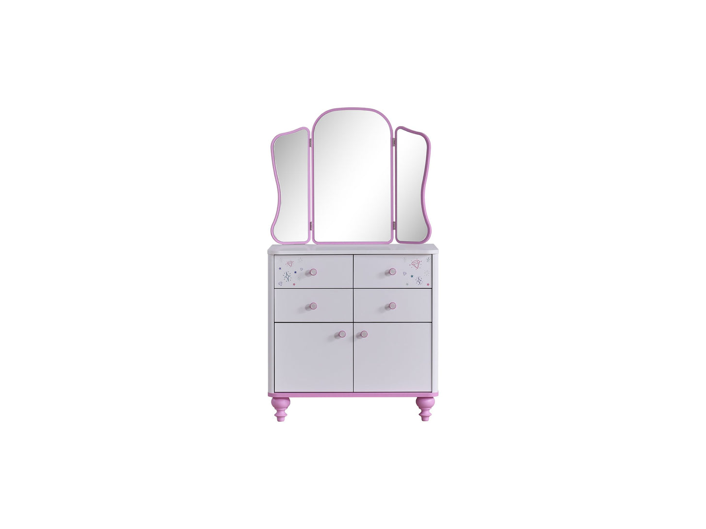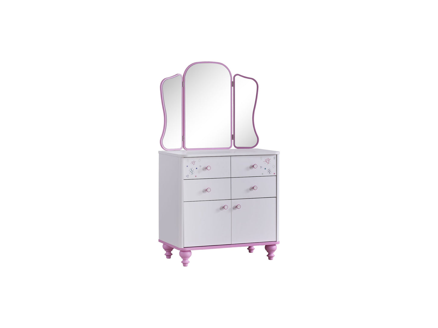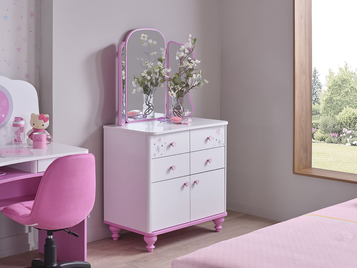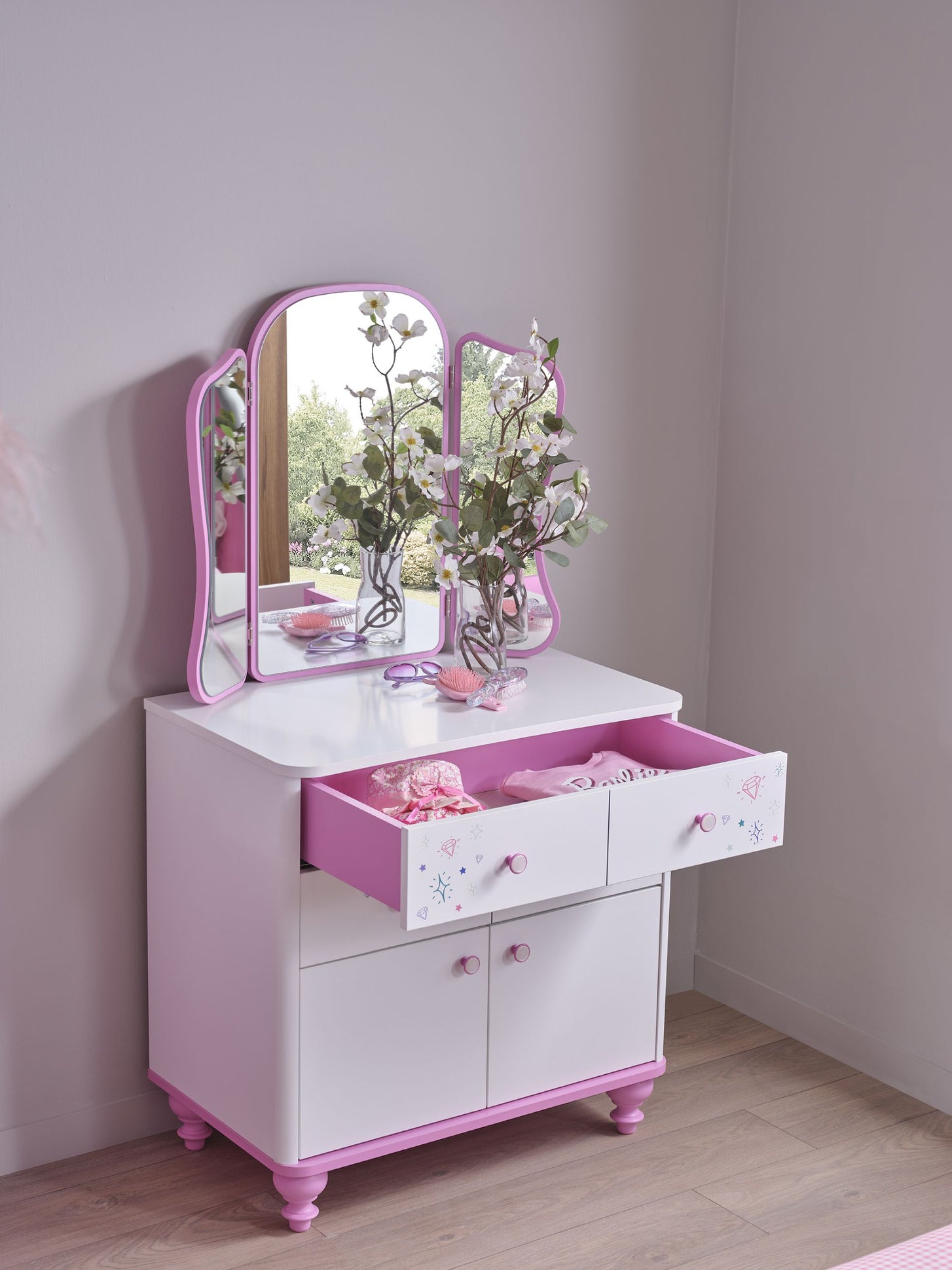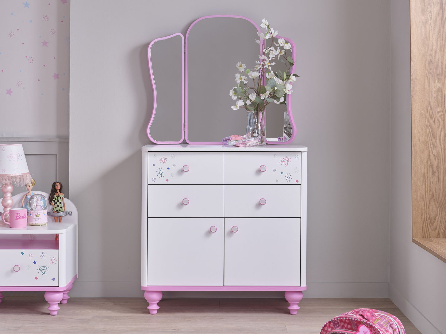 Die pinken Füße unterstreichen den femininen Look der Kommode. Als stilvolles Extra ist ein passender Spiegelaufsatz erhältlich: geschwungen gearbeitet, mit rosafarbenen Rändern und beweglichen Seitenteilen, verwandelt er die Kommode im Handumdrehen in einen eleganten Schminktisch.