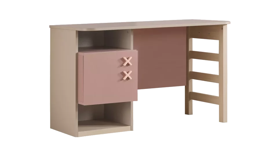 Der Kupa Nordic Schreibtisch in zarten Naturtönen wie Beige und Rosa verwandelt jedes Kinderzimmer in eine gemütliche Lerninsel. Hinter der hübschen rosafarbenen Tür verbirgt sich ein praktisches Fach, während offene Fächer und Taschenhaken für schnellen Zugriff auf Bücher, Stifte und Co. sorgen. Mit dem passenden Wandregal und -schrank aus der Nordic-Serie wird der Schreibtisch zum individuellen Stauraumwunder. - B/H/T - 120 x 75 x 60 cm