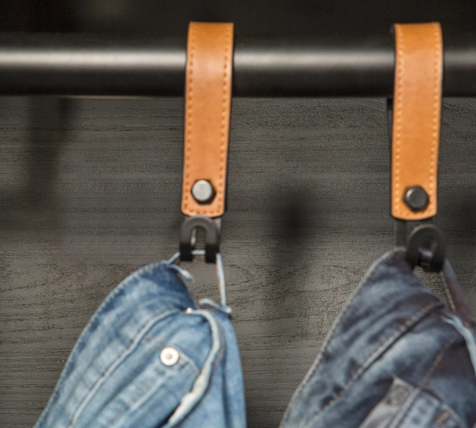 Linke Seite: Viel Platz zum Hängen an der Kleiderstange mit stylischen Lederhaken, 2 Einlegeböden und ein integrierter Schubkasten für Accessoires.