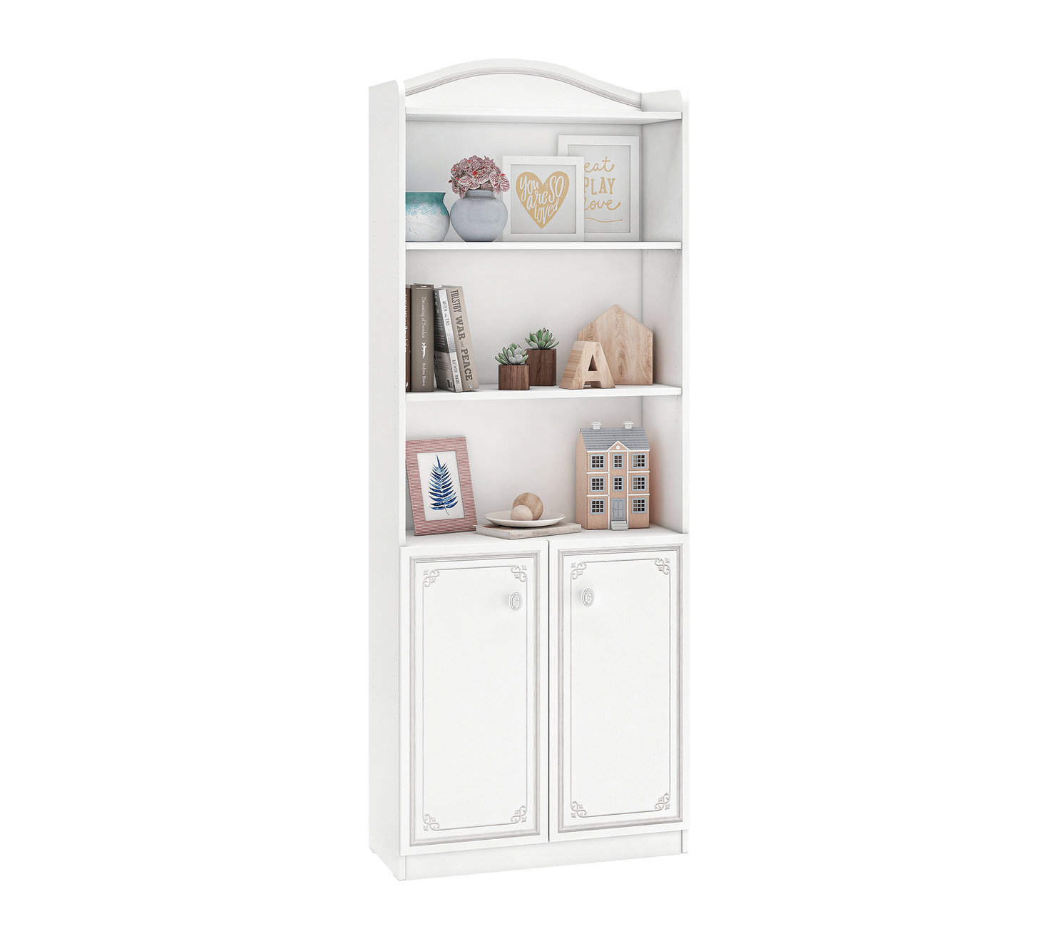 Mit dem weißen SELENA GREY Bücherregal ergänzen Sie das Kinderzimmer um ein praktisches Möbelstück, was durch seine schöne Formgebung und die dezenten grau Elemente einen optischen Akzent setzt. Es ist mit dem Möbeln der SELENA GREY Serie, aber auch mit bereits vorhandenen Möbeln kompatibel. Durch die obere Muschelschale kann Ihr Kind sogar diesen Platz als Stauraum für Bücher oder Accessoires nutzen. Dazu stehen Ihrem Liebling 3 Regalböden und ein gut erreichbarer Schrank mit 2 Türen für all seine Sachen zur Verfügung. Der Clou bei diesem Möbelstück sind die leise schließenden Türen mit einem Bremssystem. In unserem Online-Shop finden Sie passende Möbelstücke wie ein Bett, einen Kleiderschrank, einen Schreibtisch und vieles mehr, um das Bücherregal im Kinderzimmer zu ergänzen.