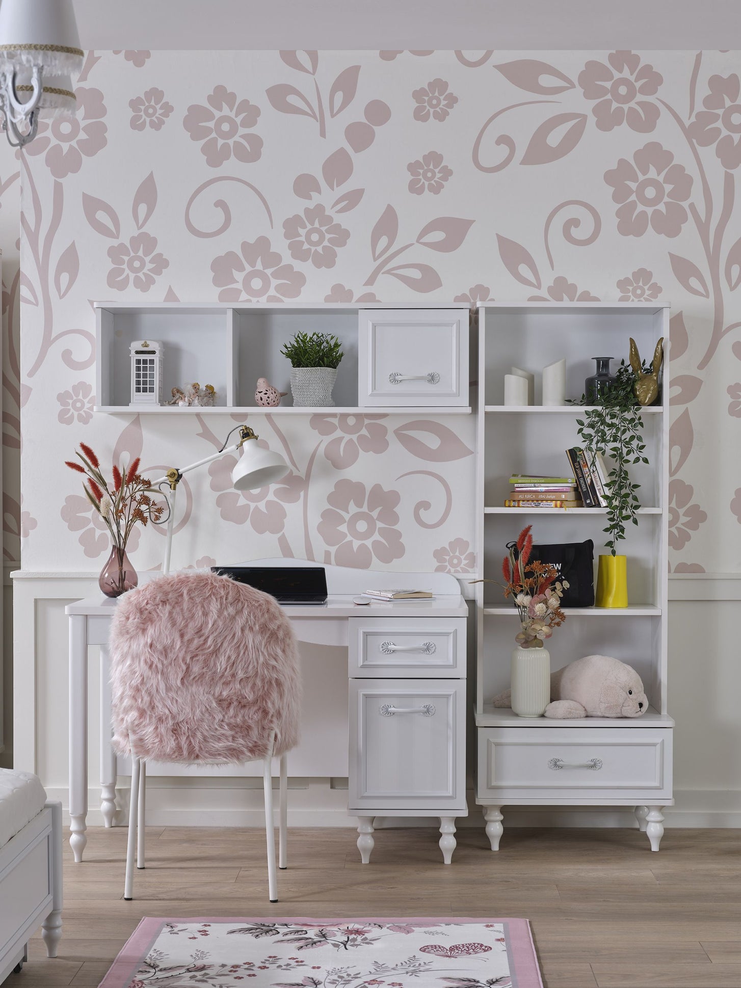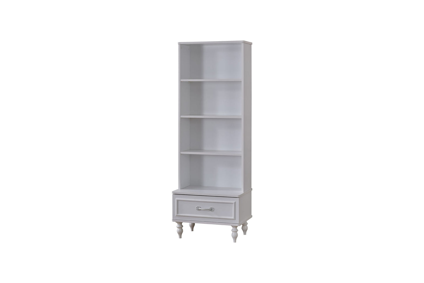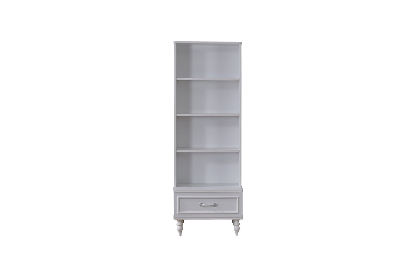 Das Bücherregal JULIETTE von Kupa vereint romantischen Landhausstil mit funktionaler Aufteilung. Es bietet vier großzügige, offene Regalfächer für Bücher, Deko oder Spielsachen sowie eine tiefe Schublade für zusätzlichen Stauraum. Gefertigt aus weißem Holz, besticht das Regal durch gedrechselte Füße und eine verzierte Schubladenfront, die dem Möbelstück eine charmante und verspielte Ausstrahlung verleihen.