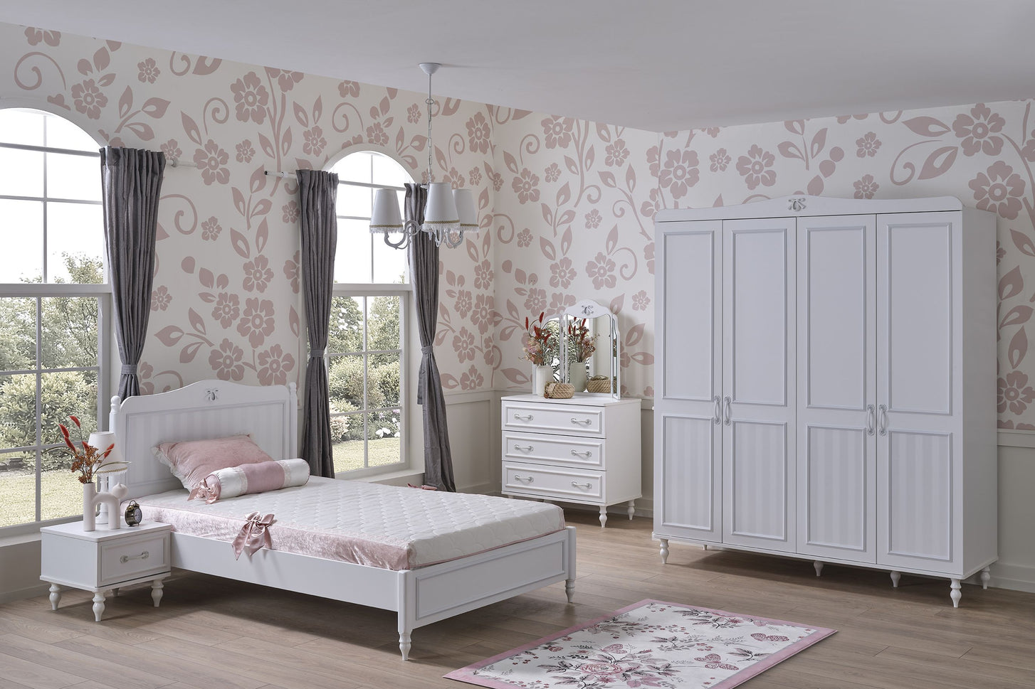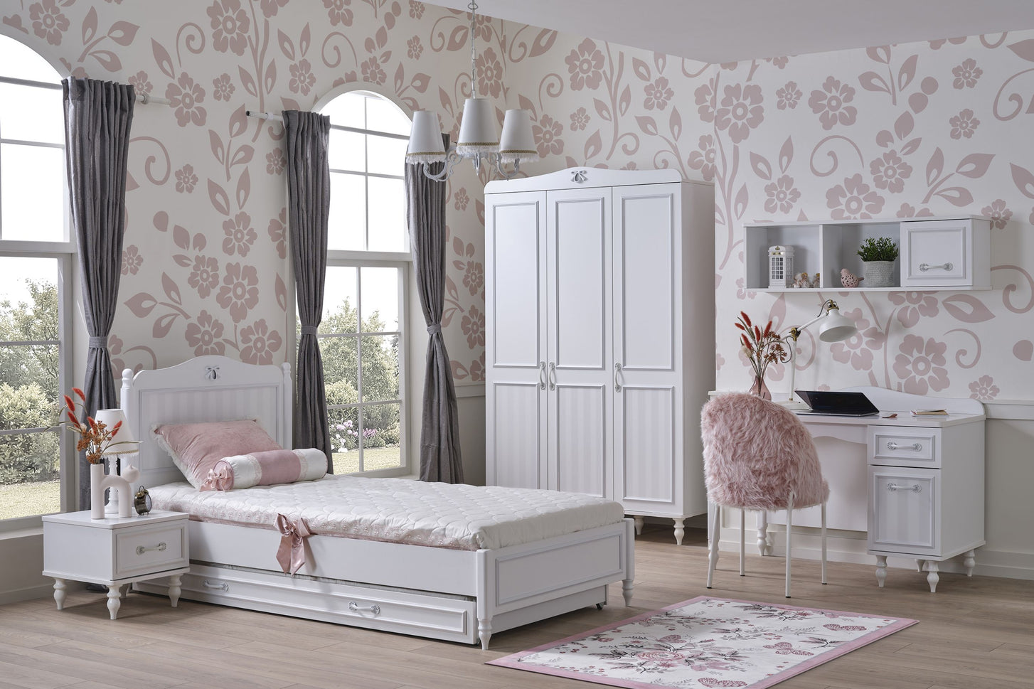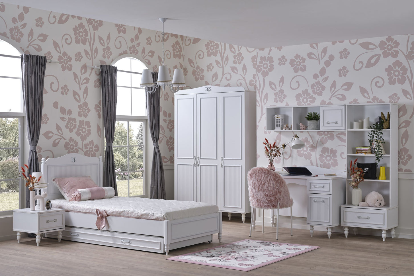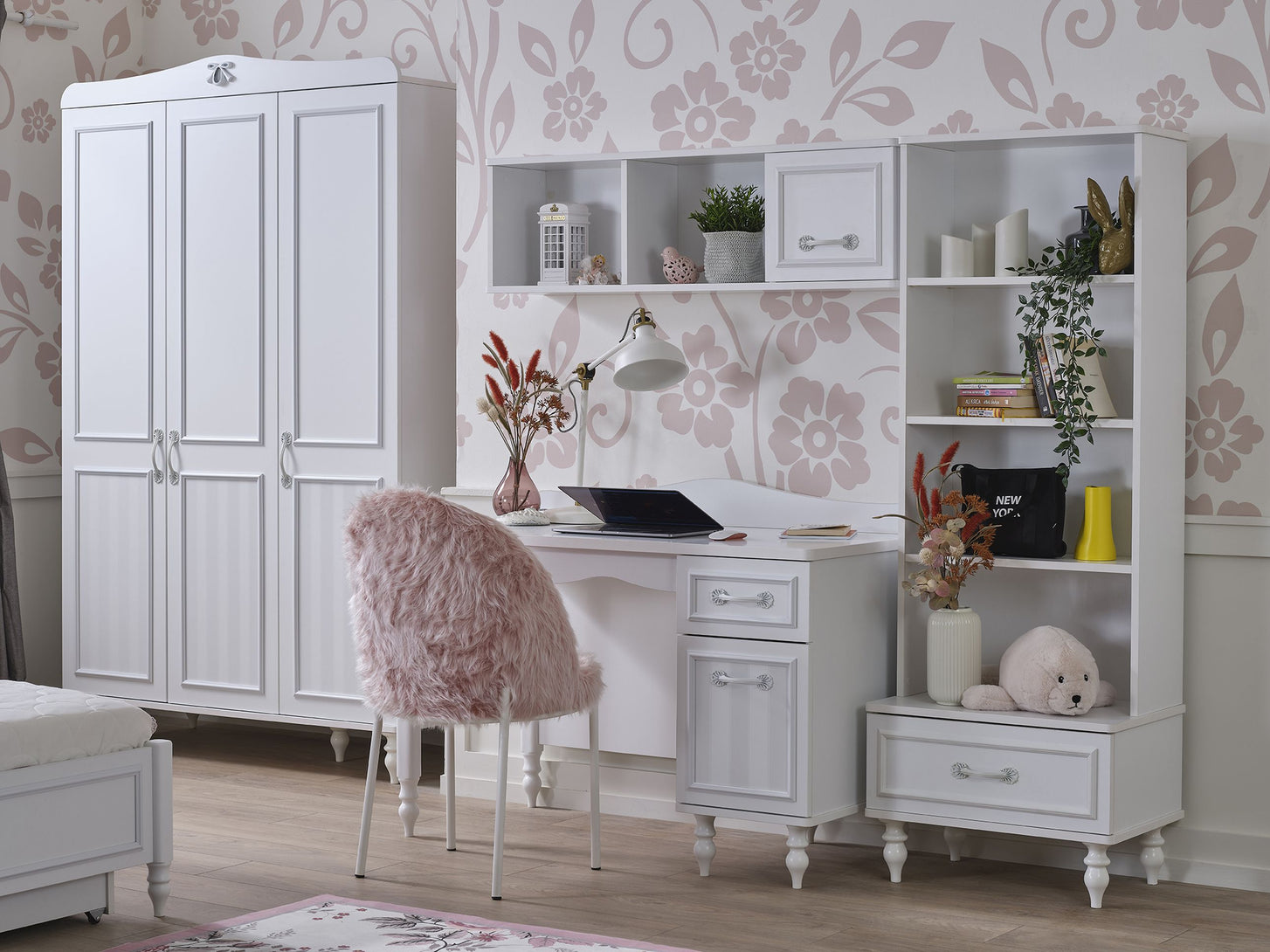 Das Bücherregal JULIETTE von Kupa vereint romantischen Landhausstil mit funktionaler Aufteilung. Es bietet vier großzügige, offene Regalfächer für Bücher, Deko oder Spielsachen sowie eine tiefe Schublade für zusätzlichen Stauraum. Gefertigt aus weißem Holz, besticht das Regal durch gedrechselte Füße und eine verzierte Schubladenfront, die dem Möbelstück eine charmante und verspielte Ausstrahlung verleihen.